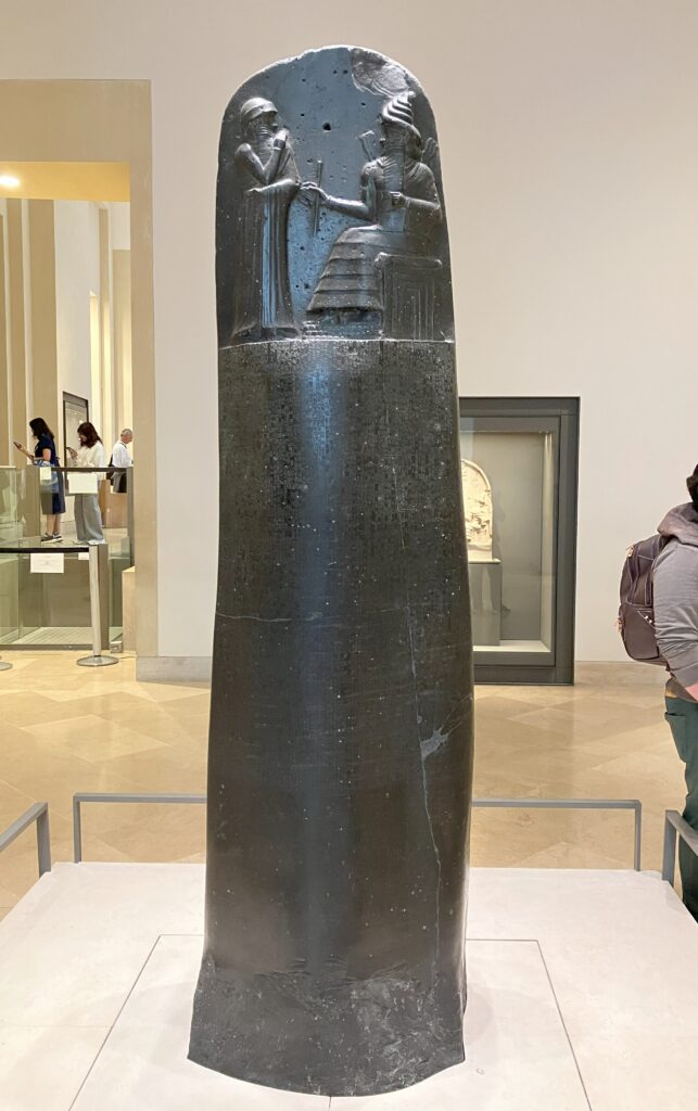 《ハムラビ法典》の前では、多くの人が静かにその石碑を見上げています。